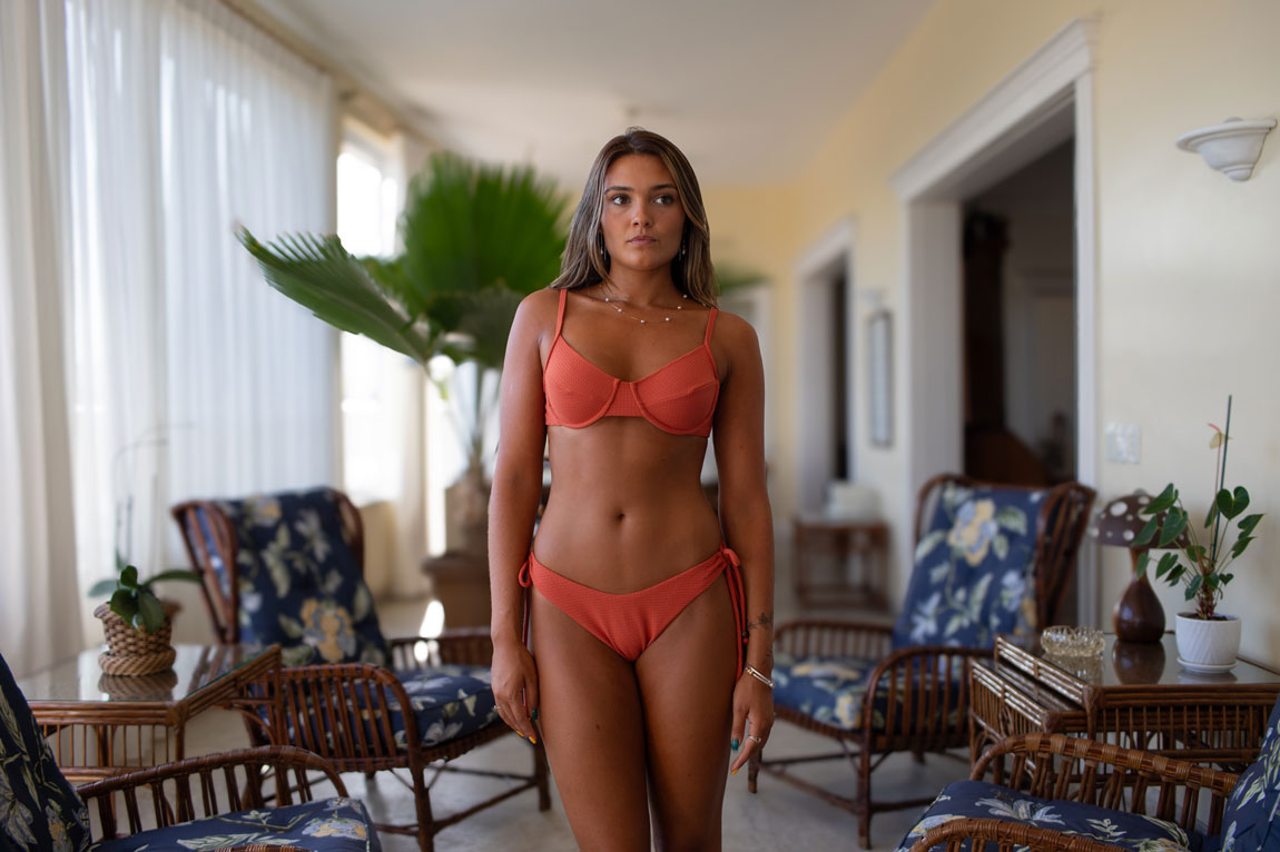 O Biquíni CONCHA TERRA apresenta um top estilo retrô, modelo meia taça com aro e alças reguláveis. A calcinha é inteira, basiquinha e destaca o bumbum. Essa cor fica maravilhosa com o bronzeado. 💛