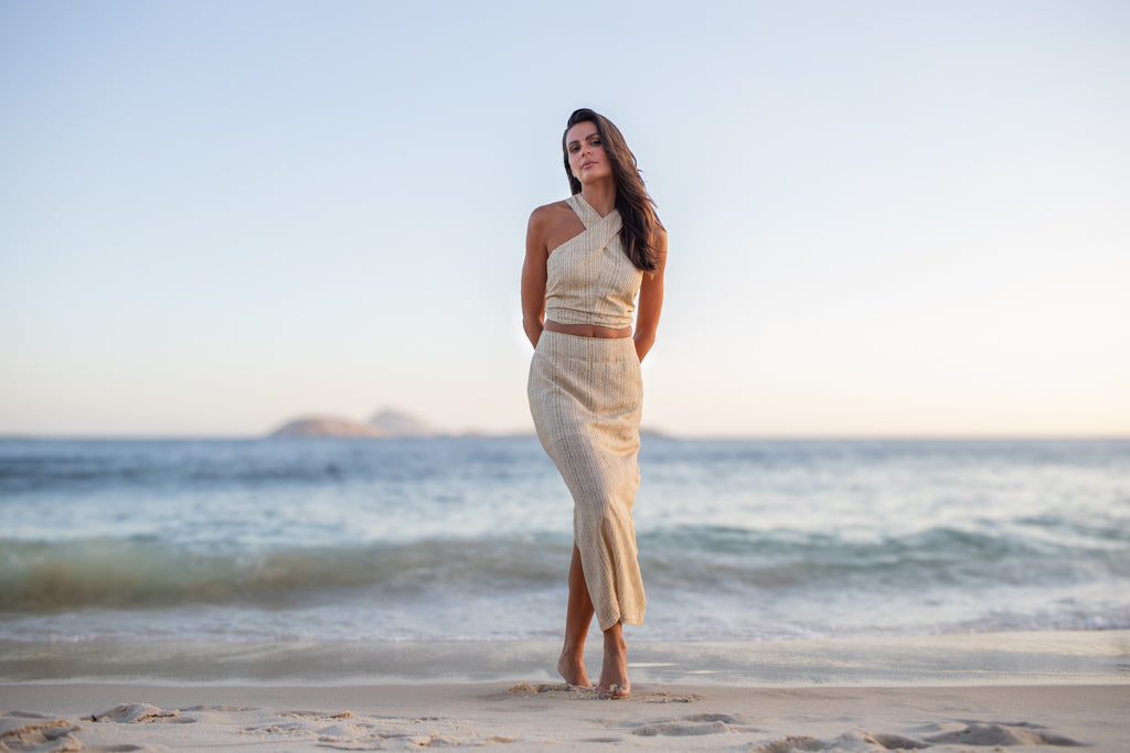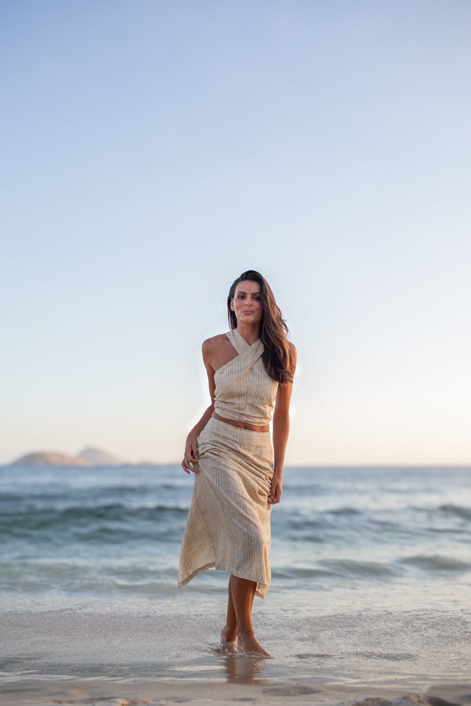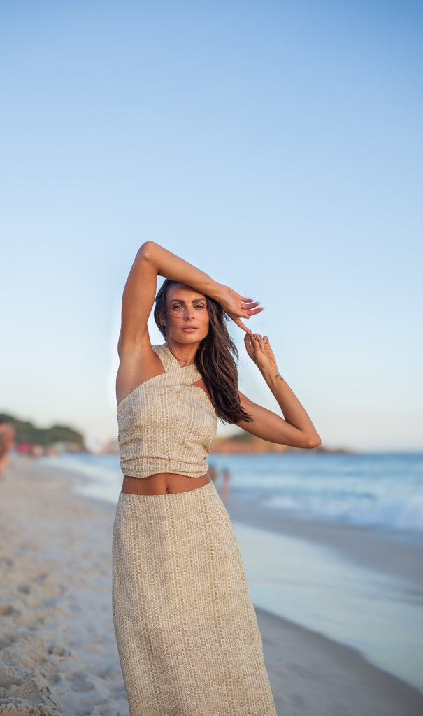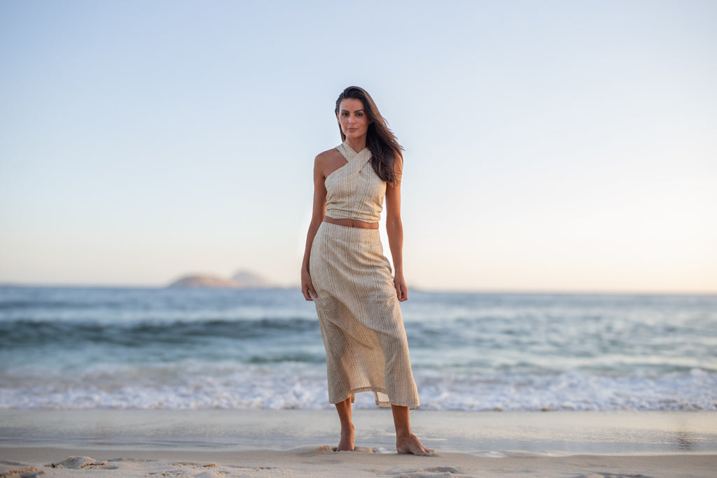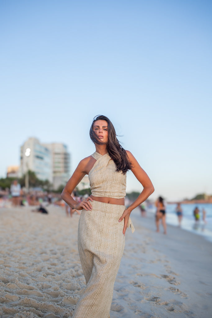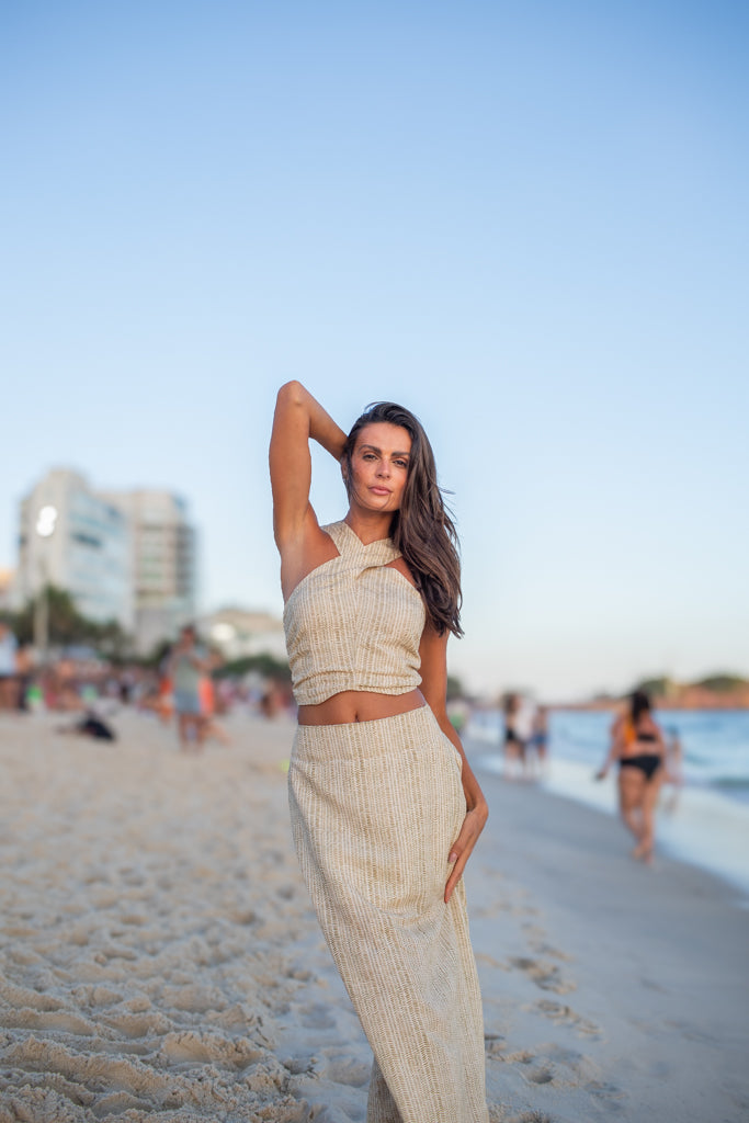 O conjunto é feito com tecido leve, perfeito para os dias quentes — seja para um almoço à beira-mar, um passeio no fim de tarde ou um jantar sob o céu estrelado.