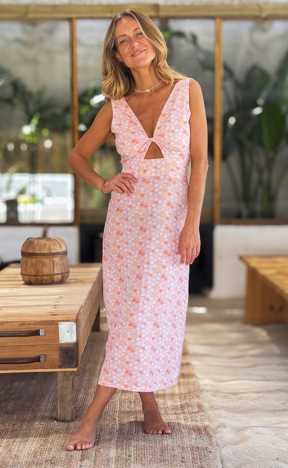 O Vestido tem um recorte frontal que valoriza a silhueta, ele tem um caimento que abraça o corpo com leveza. As costas abertas e o detalhe torcido no busto criam um visual impactante, mas sempre com sofisticação.