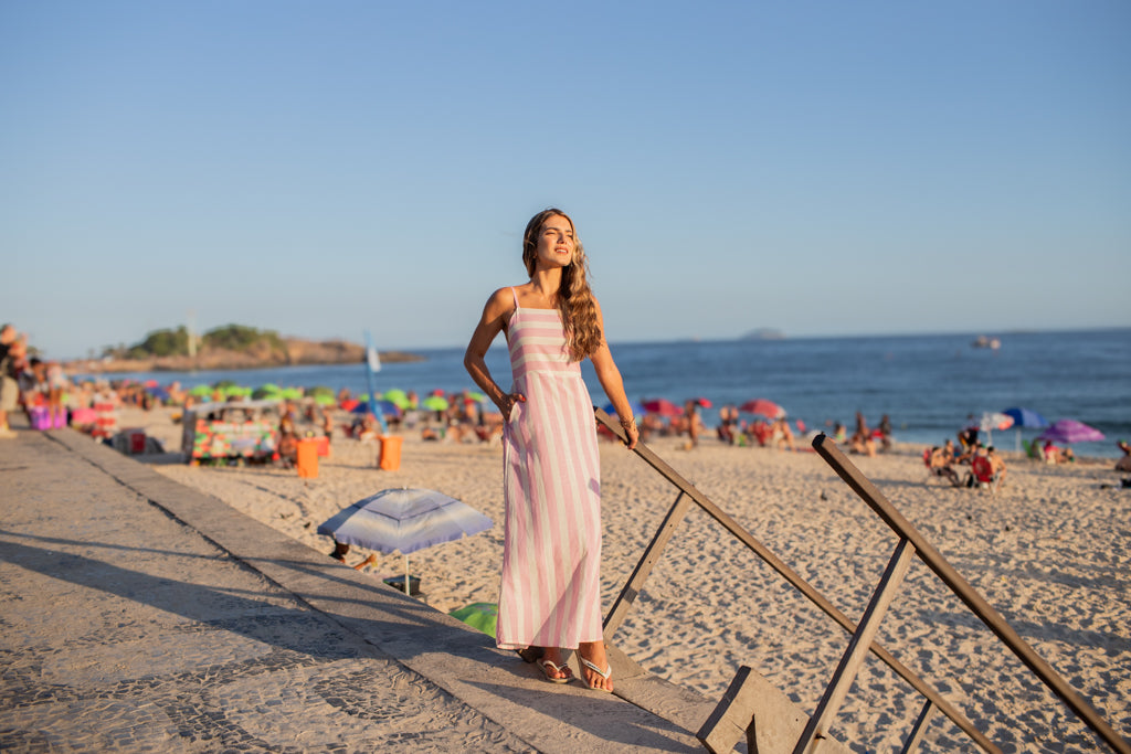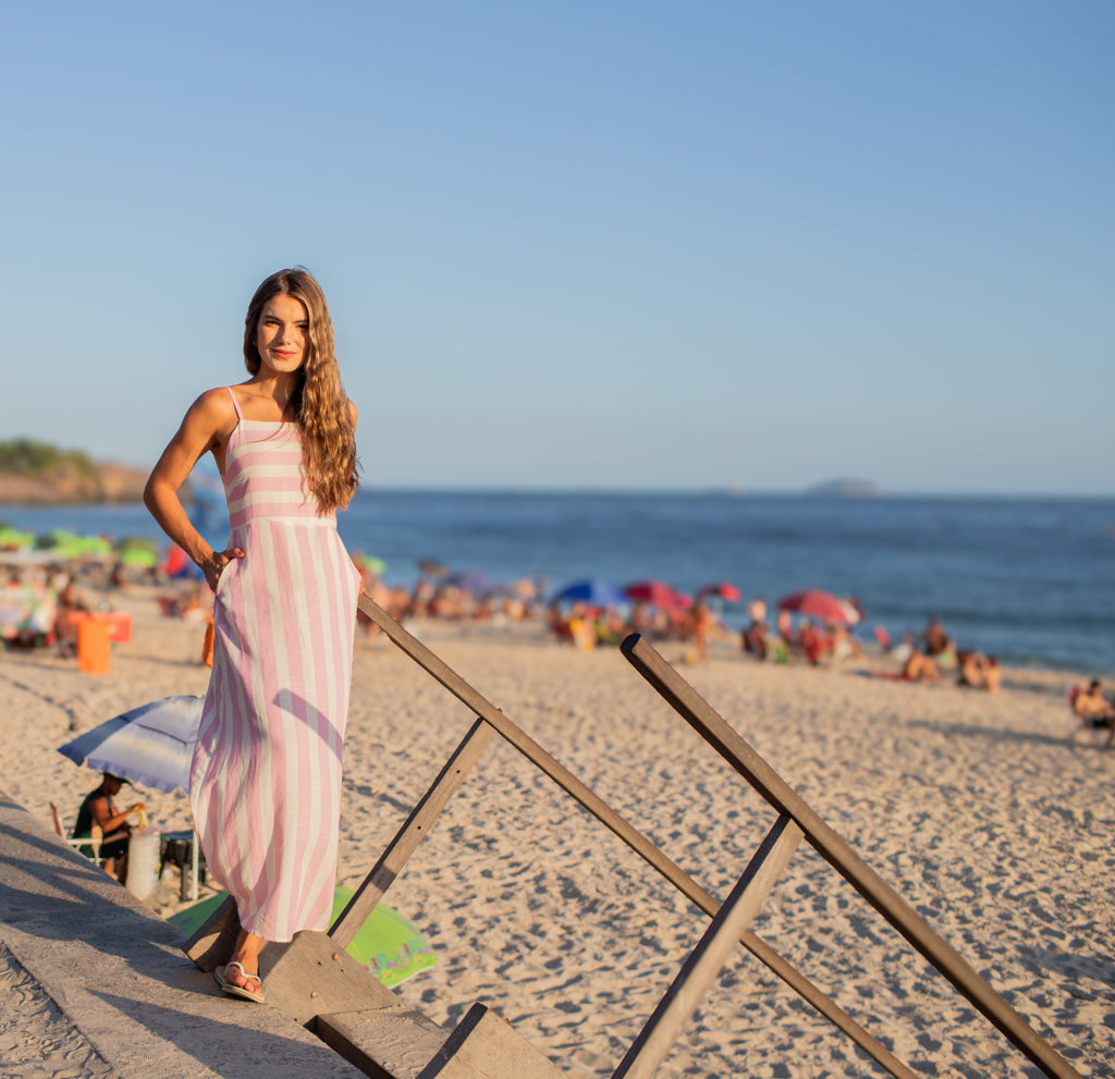 Com um ar descomplicado e cheio de charme, o vestido jardineira é a escolha ideal para os dias de sol. Ele tem decote reto na frente e costas abertas com alças finas e reguláveis, que garantem um ajuste perfeito ao corpo. O comprimento longo traz elegância, enquanto os bolsos laterais adicionam um toque funcional ao visual.