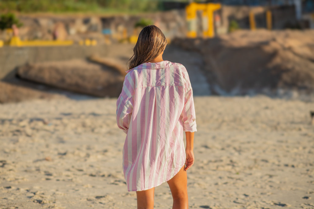 A peça que transita com naturalidade entre o dia na praia e os compromissos do cotidiano. Feita em tecido leve com listras suaves e bolsos frontais, a camisa maxi é aquele item curinga que combina frescor e elegância na medida certa.